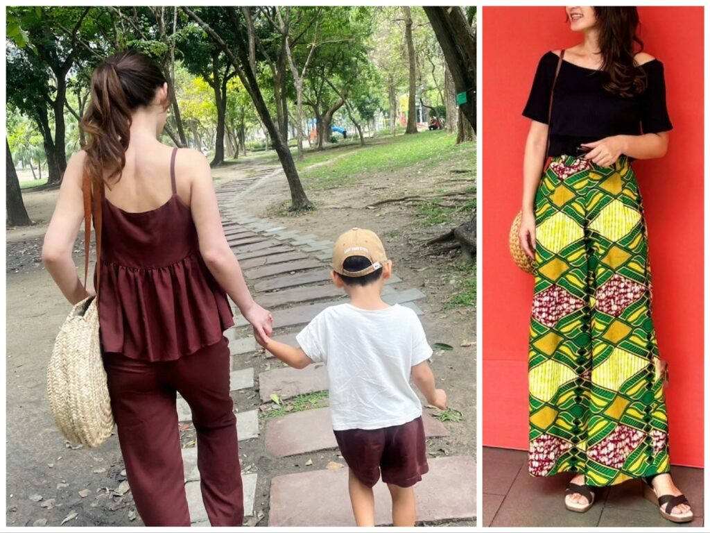 私はこちらのブラウンセットアップのパンツの形違い(アフリカ布パンツのかたち)が欲しくて、息子もパンツが気に入ってたのに小さくなってきたのでサイズ違いお仕立てすることに。