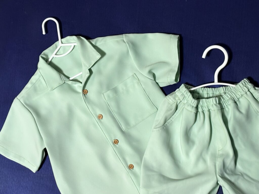 前にお仕立てしたピンクのワンピースと同じ生地で色違い、息子とリンクコーデしたくてこの色にしました。